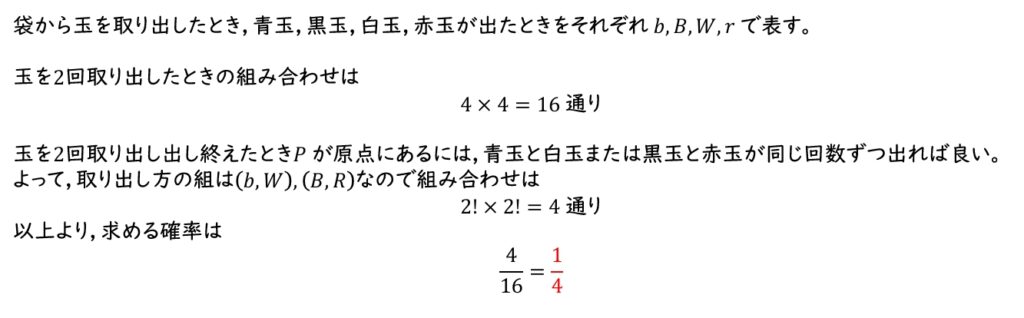 (1)\(P\) が原点にあるには,青玉と白玉または黒玉と赤玉が同じ回数ずつ出れば良い。