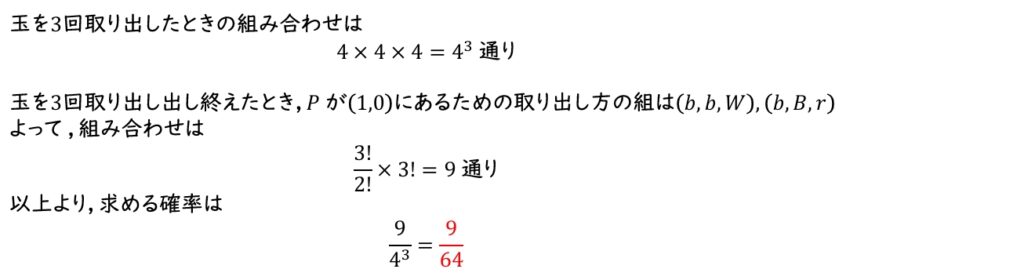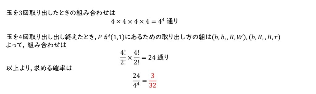 (3) 玉を3回取り出し終えたとき,\(P\) が点 \((1,1)\) にある。