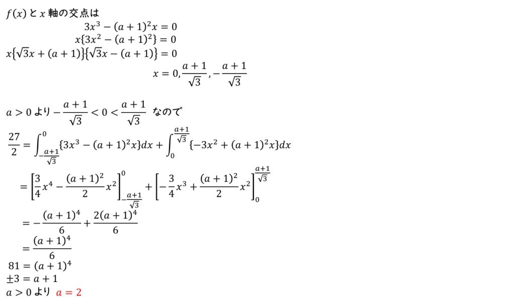 (1) 曲線 \(y=f(x)\) と \(x\) 軸で囲まれたすべての部分の面積の和が \(\dfrac{27}{2}\) となるとき,\(a\) の値を求めよ。