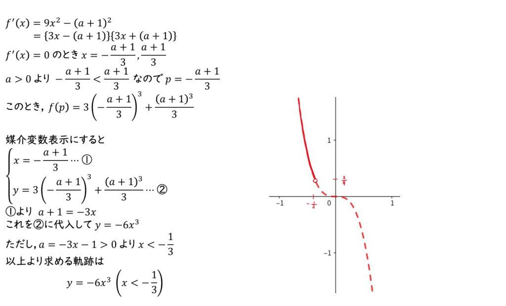 (2) \(f(x)\) が極大となる \(x\) の値を \(p\) とおく。\(a\) が正の実数全体を動くとき,点 \((p,f(p))\) の軌跡を図示せよ。