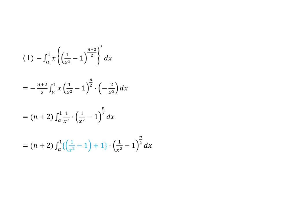 そうすると\(-(n+2)\int_{a}^{1} \frac{1}{x^2}\cdot (\frac{1}{x^2}-1)^{\frac{n}{2}} dx\)が出てくるが、これを\(-(n+2)\int_{a}^{1} \{(\frac{1}{x^2}-1)+1\}\cdot (\frac{1}{x^2}-1)^{\frac{n}{2}} dx\)と変形出来るかどうかが勝負である。