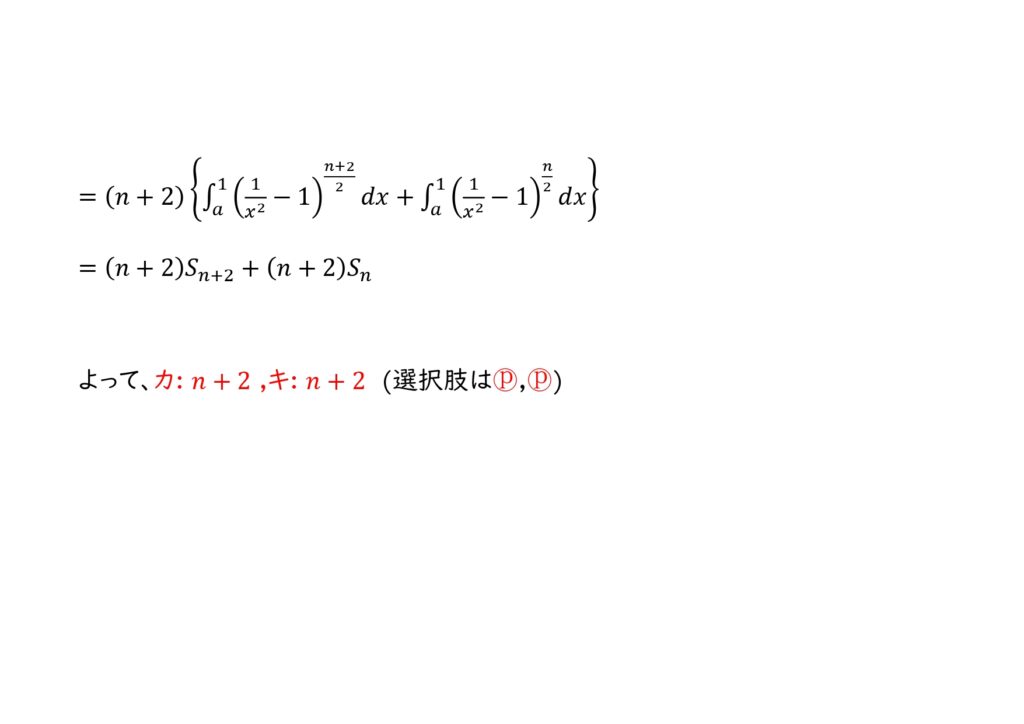 (1)カ、キ: \(-\int_{a}^{1} x\{(\frac{1}{x^2}-1)^{\frac{n+2}{2}}\}^{\prime}\ dx\)を部分積分を使って解こうとしても、結局もとの\(S_{n+2}\)が出てくるだけで意味はない