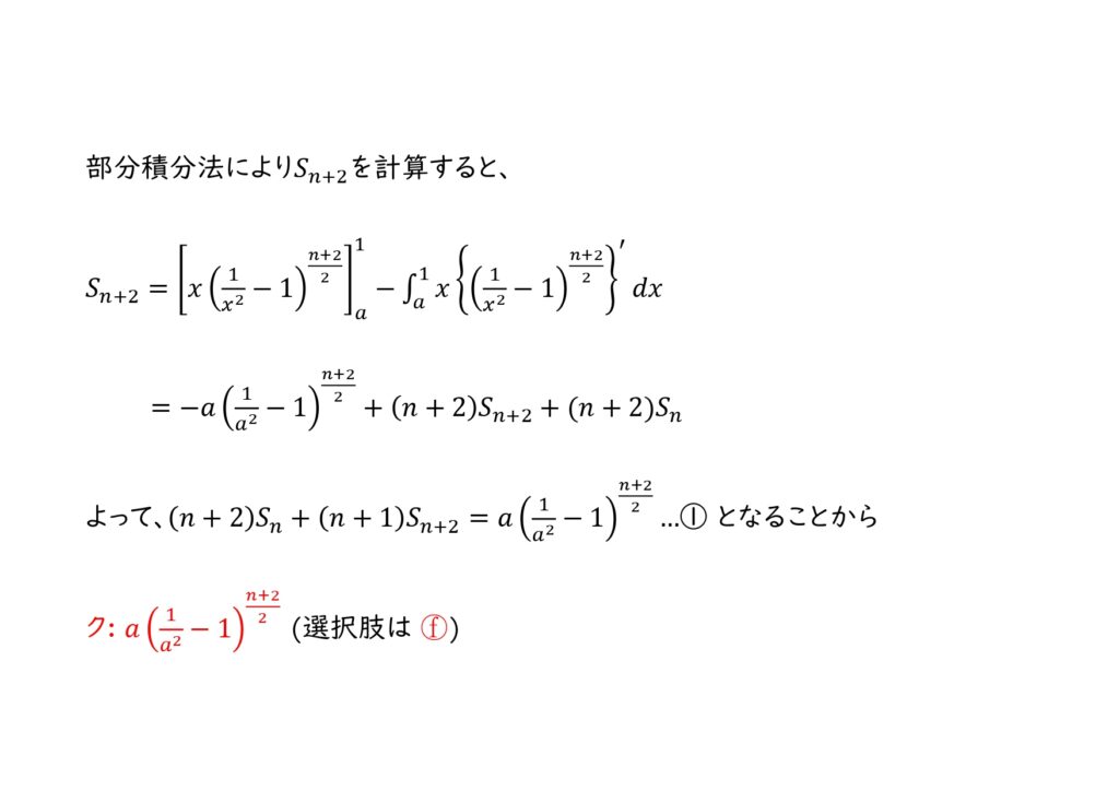ク: 上での誘導を用いて、\(S_{n+2}\)を部分積分法を用いて計算する。