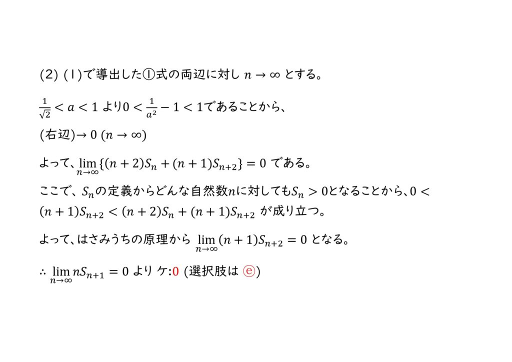 (2) \(S_n>0\)に注意すると、\(\frac{1}{\sqrt{2}}<a<1\)と①より、次が成り立つ。\[\lim_{n\to \infty} nS_{n+1}=\boxed{ ケ }…②\]