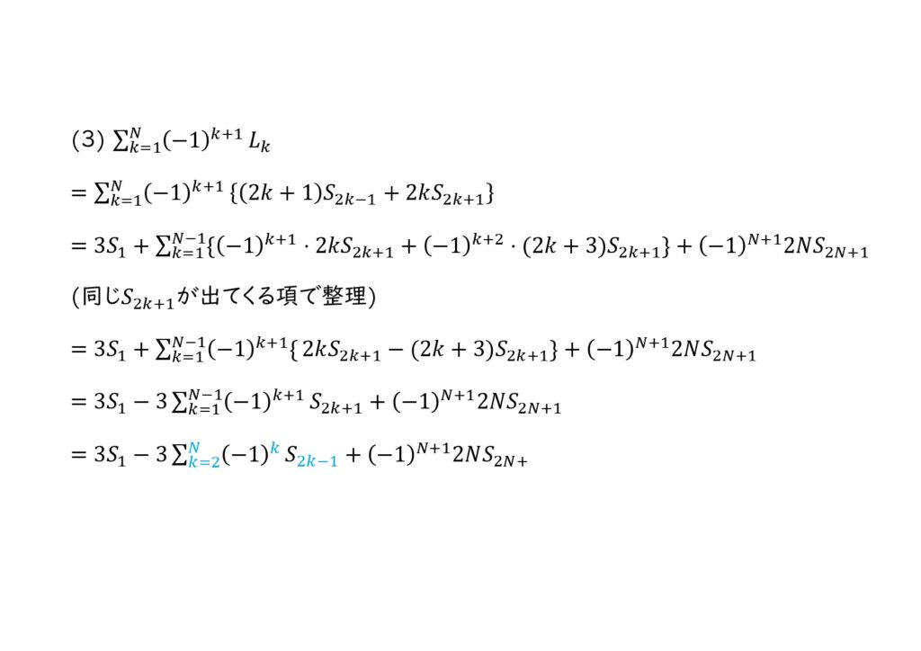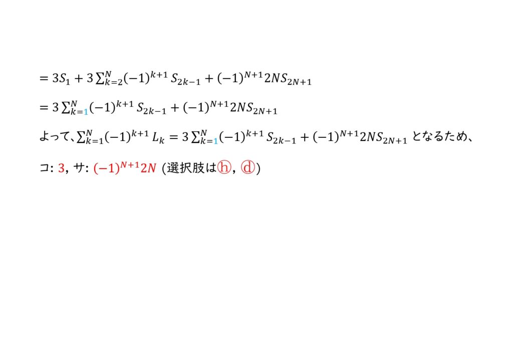 (3)コ,サ: \(\sum_{k=1}^{N} (-1)^{k+1}L_k=\sum_{k=1}^{N} (-1)^{k+1}\{(2k+1)S_{2k-1}+2kS_{2k+1}\}\) となる。