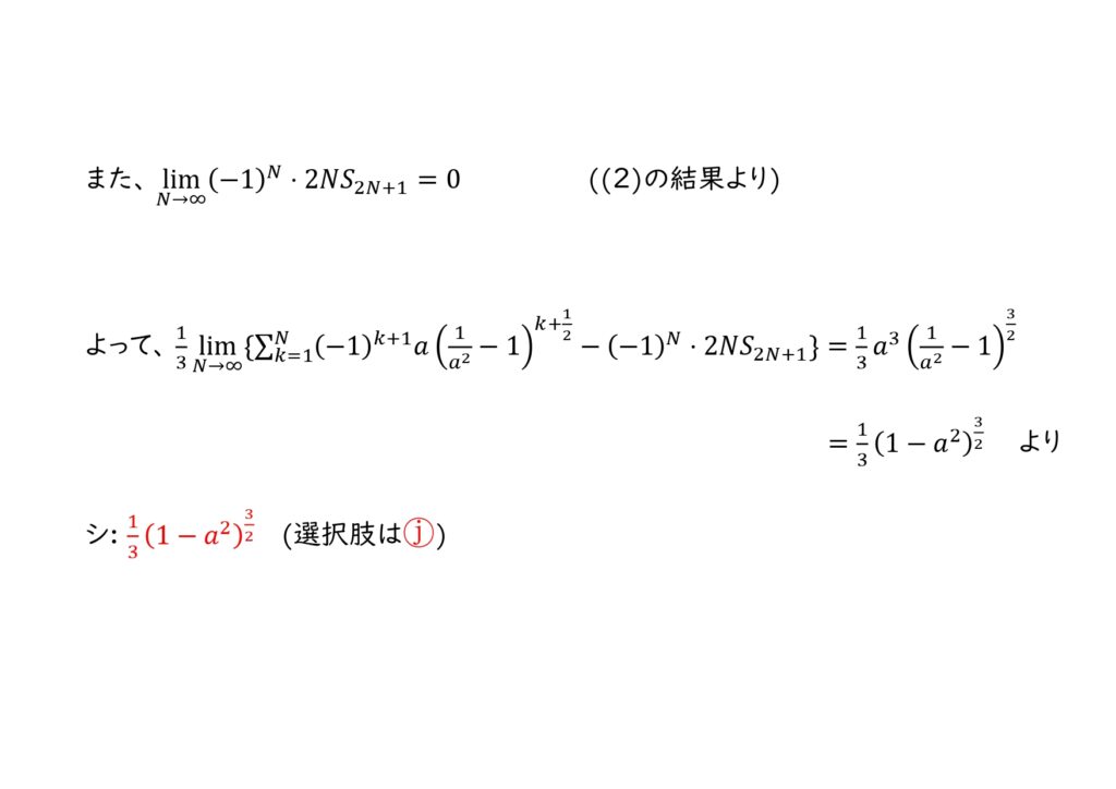 シ: 上のコ,サで求めた式を\(\sum_{k=1}^{\infty} (-1)^{k+1}S_{2k-1}=\) の形に直すことで、\(S_1-S_3+S_5-…=\frac{1}{3}\lim_{N\to \infty} \{\sum_{k=1}^{N} (-1)^{k+1}R_k -(-1)^{N+1}2NS_{2N+1} \}\)が得られる。