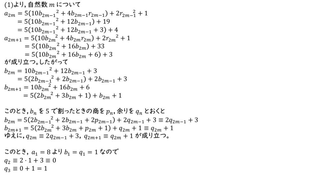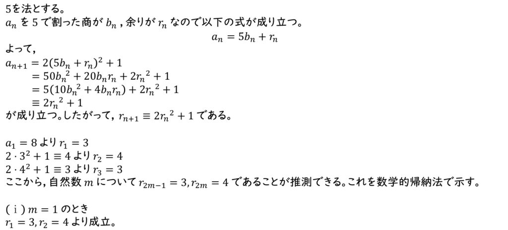 (1) \(a_n\) を \(5\) で割った商が \(b_n\),余りが \(r_n\) なので \(a_n=5b_n+r_n\) が成り立つ。これを \(a_{n+1}=2a_n^2+1\) に代入して計算すると \(r_{n+1}\) が求められるので,具体的な数値から \(r_n\) を推測し,数学的帰納法によってそれを示す。