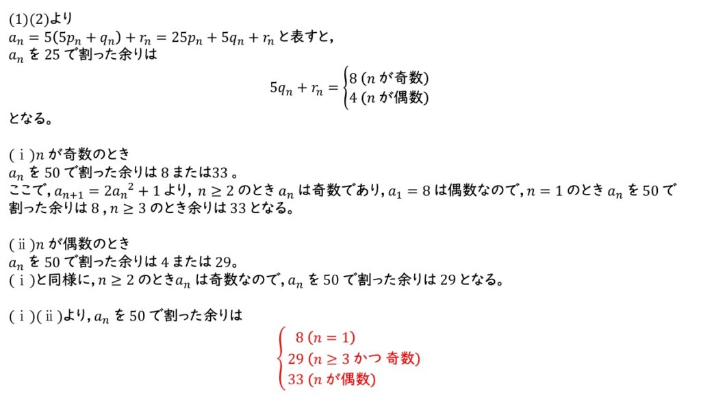 (3) \(a_n=5(5p_n+q_n)+r_n=25p_n+5q_n+r_n\) と表せる。これを \(25\) で割った余りから \(n\) が奇数の場合と偶数の場合で場合分けして \(50\) で割った余りを考える。このとき \(a_{n+1}=2a_n^2+1\) から \(n\ge 2\) のとき \(a_n\) が奇数になることに着目する。