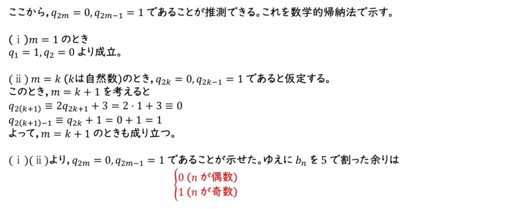 (2) \(a_n\) について \(n\) が偶数のときと奇数のときに場合分けして考える。\(b_n\) を \(5\) で割ったときの商を \(p_n\) ,余りを \(q_n\) とおく。(1)同様に \(q_n\) について推測ができるので,数学帰納法を用いてそれを証明する。