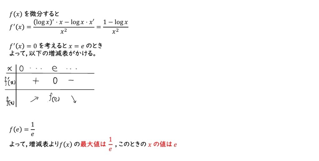 (1) \(f(x)\) を商の微分法を用いて微分すると \(f'(x)=\dfrac{1-\log{x}}{x^2}\) となる。\(f'(x)=0\) になる \(x\) の値を求めて,\(x>0\) の増減表を考える。
