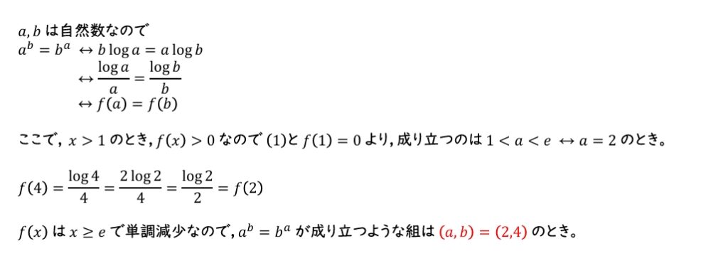(3) \(a,b\) は自然数なので,\(a^b=b^a\) ⇔ \(b\log{a}=a\log{b}\) ⇔ \(f(a)=f(b)\) となる。