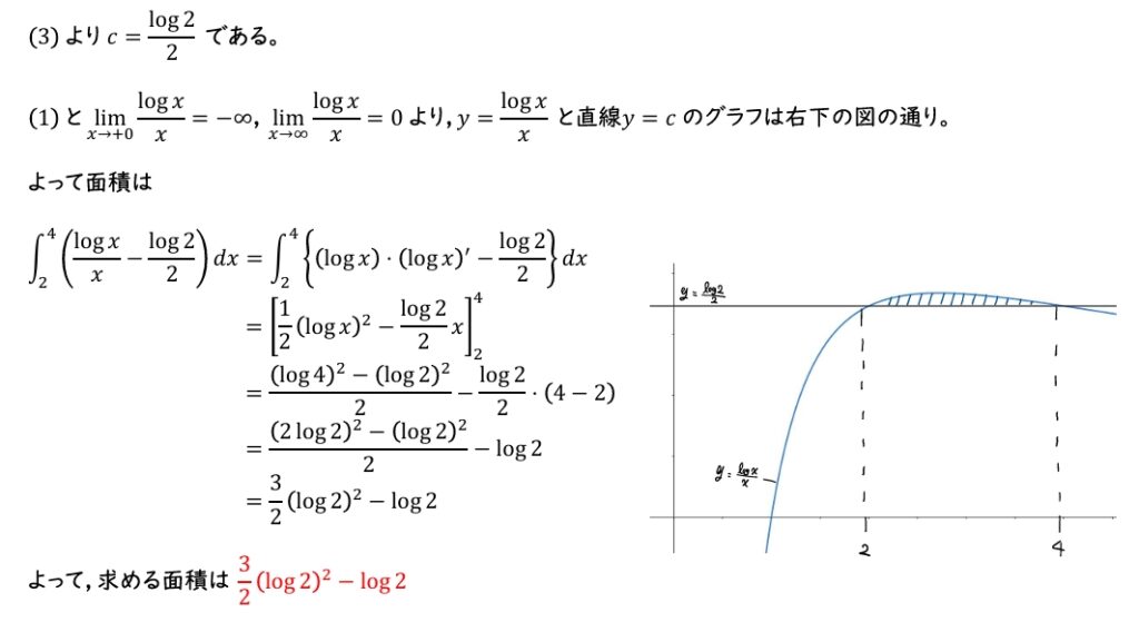 (4) (3) より \(c=\dfrac{\log{2}}{2}\) である。\(f(x)\) と \(y=c\) の関係をグラフを用いて考え,積分で面積を求める。