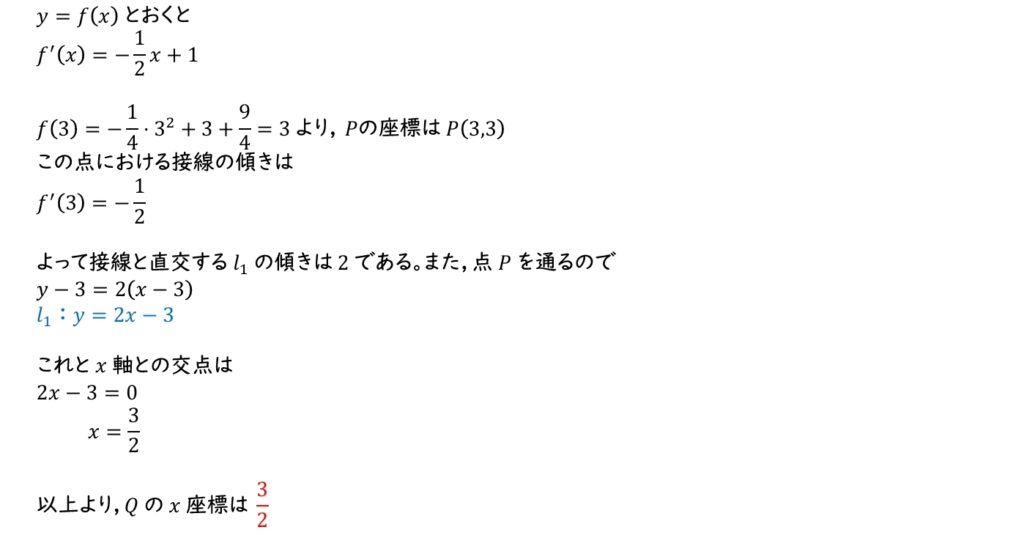 (1) \(y=f(x)\) とおくと \(f'(3)\) は \(P\) における接線の傾きである。\(l_1\) はこの接線と直交するので \(l_1\) の傾きと \(P\) における接線の傾きの積は \(-1\) 。