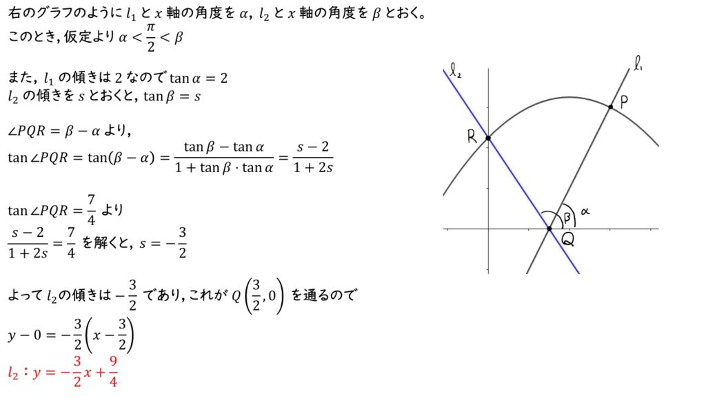 (2) \(l_1\),\(l_2\) と \(x\) 軸の角度をそれぞれ \(\alpha\),\(\beta\) とおく。このとき,それぞれの傾きは \(\tan{\theta}\) と等しい。また,\(\tan{\angle PQR}=\tan{(\beta-\alpha)}\) である。