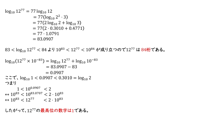 (1) \(12^{77}\)の桁数および最高位の数字を求めよ。ただし,\(\log_{10} 2=0.3010\), \(\log_{10} 3=0.4771\)とする。