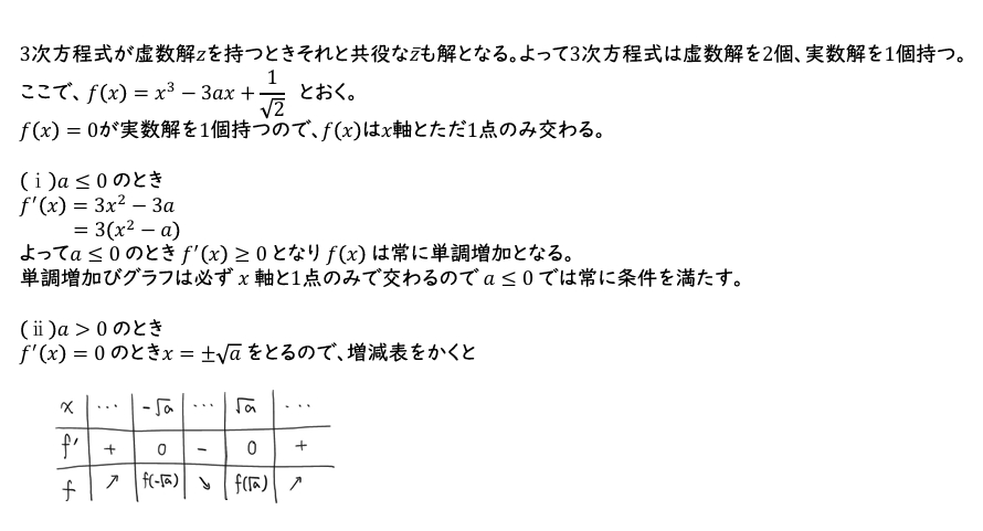 (2)3次方程式が虚数解\(z\)を持つときそれと共役な\(\bar{z}\)も解となる。つまり、3次方程式は虚数解を2個と実数解を1個持つ。実数解を1個持つときの条件を考えてみよう!