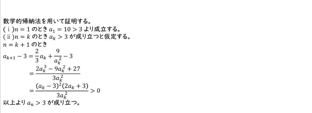 (1)すべての自然数\(n\)に対して\(a_n>3\)が成り立つことを示せ。