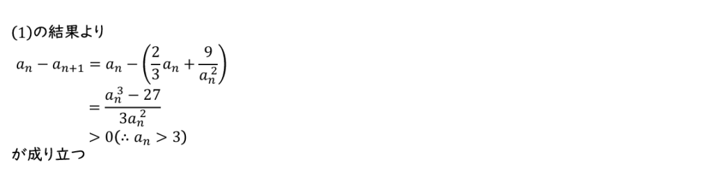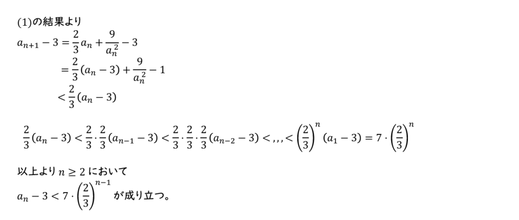 (3)(1)の結果を用いて\(a_{n+1}-3\)を\(\dfrac{2}{3}(a_n-3)\)と比較してみよう。