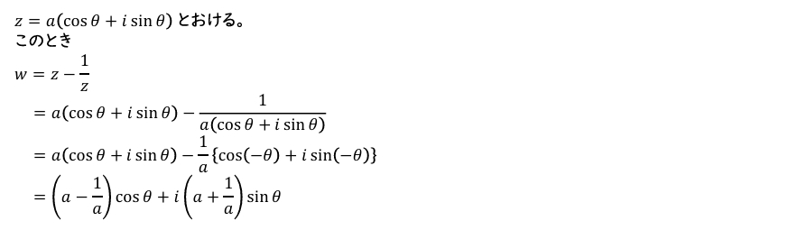(2)\(z=a(\cos\theta+i\sin\theta\)) とおける。これを \(w=z-\dfrac{1}{z}\) に代入して計算する。