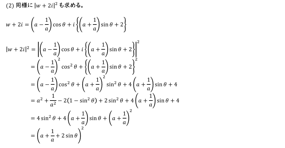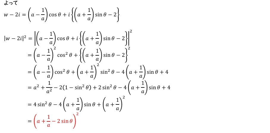 (2)\(|w-2i|^2\) を \(a\) と \(\sin\theta\) を用いて表せ 。