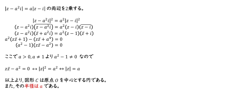 \(i\) を虚数単位とする。\(a\) は \(1\) でない正の実数の定数とする。複素数平面において, 方程式 \(|z-a^2i|=a|z-i|\) を満たす点 \(z\) が表す図形を \(C\) とする。