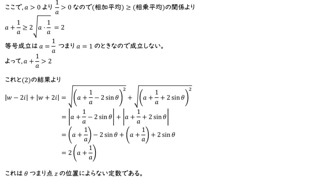 (3)\(|w-2i|+|w+2i|\) は点 \(z\) の位置によらない定数であることを示せ。
