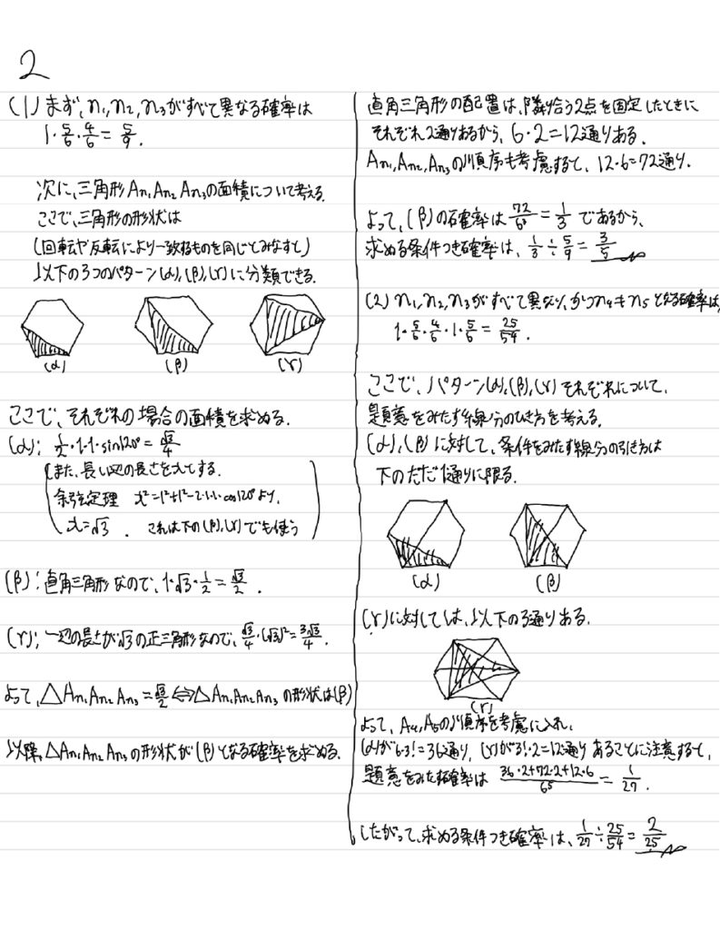(2)「\(n_1,n_2,n_3\)がすべて異なり、かつ、\(n_4\ne n_5\)である」という条件のもとで、「線分\(A_{n_4}A_{n_5}\)が三角形\(A_{n_1}A_{n_2}A_{n_3}\)の面積を二等分する」という条件付確率