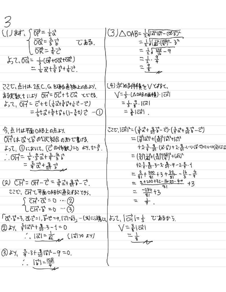 (4) 「直線\(CH\)が平面\(OAB\)と直交する」という条件から、求める体積を\(V\)とすると\[V=\frac{1}{3}\cdot (\triangle OABの面積)\cdot |\overrightarrow{CH}|\]が成り立つ。