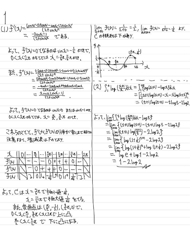 (1)関数\(f(x)=\frac{\cos{x}}{2+\sin{x}}\) \((0<x<2\pi)\)に対して、\(xy\)平面上の曲線\(y=f(x)\)を\(C\)とする。\(f(x)\)の増減、極値、\(C\)の凹凸、変曲点を調べ、\(C\)の概形を描け。