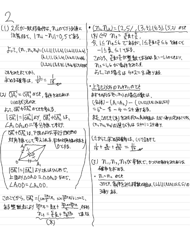 1個のさいころを3回投げ、出た目を順に\(n_1, n_2, n_3\)とする。\(O\)を原点とする\(xy\)平面上の点\(A_1, A_2, A_3\)を\[A_k=(\cos{(\frac{2n_k}{5}\pi), \sin{(\frac{2n_k}{5}\pi)}})\ (k=1,2,3)\]によって定める。次の問に答えよ。
