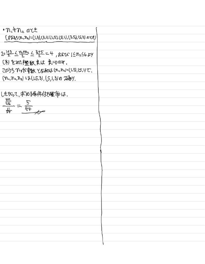 (3)\(\overrightarrow{OA_1}+\overrightarrow{OA_2}\)と\(\overrightarrow{OA_3}\)が平行になるという条件のもとで、\(n_1, n_2, n_3\)がすべて奇数である条件付き確率を求めよ。