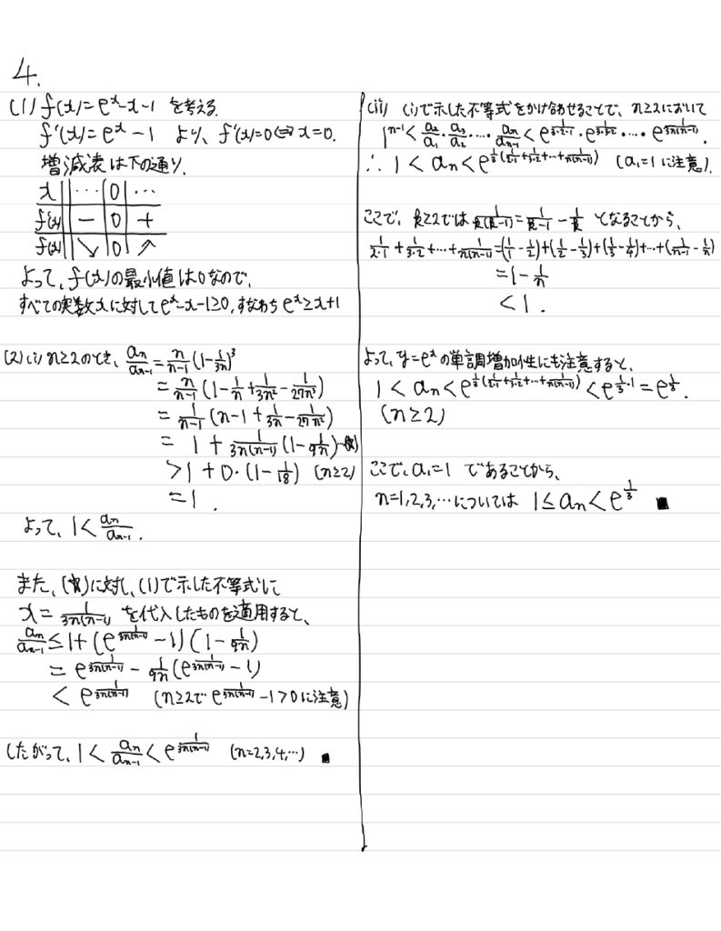 \(a_1=1\)であることと、(i)の不等式は\(n\geq 2\)のときに成り立つことに注意すると、2以上の\(n\)については\[1^{n-1}<a_n<e^{\frac{1}{3}(\frac{1}{2\cdot 1}+\frac{1}{3\cdot 2}+…+\frac{1}{n(n-1)})}\]と表される。