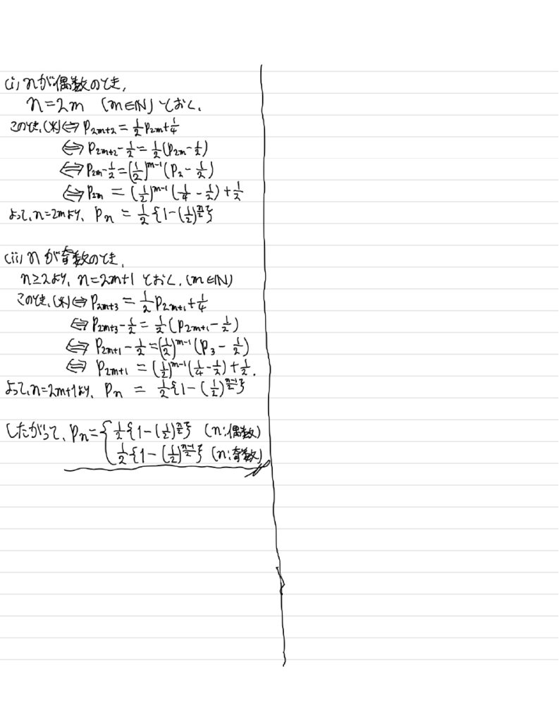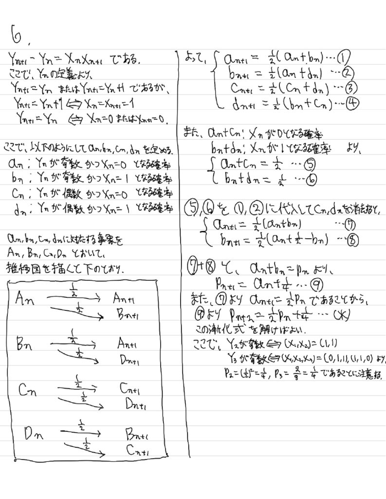\(Y_{n+1}-Y_n=X_nX_{n+1}\)となることから、\(X_n\)と\(X_{n+1}\)の値によって4通りに分けて確率を考え、それぞれの相関を表す漸化式を立てて解く。
