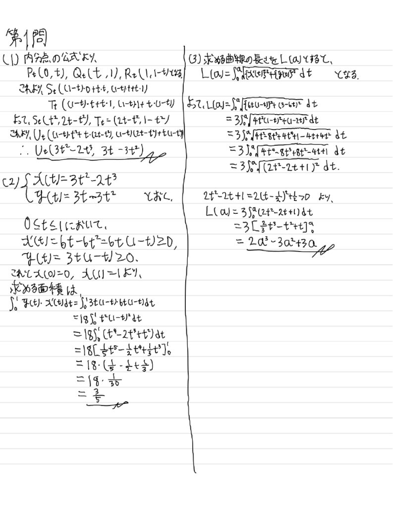 (2)パラメーター\(t\)によって表されている曲線の面積を求める問題である。