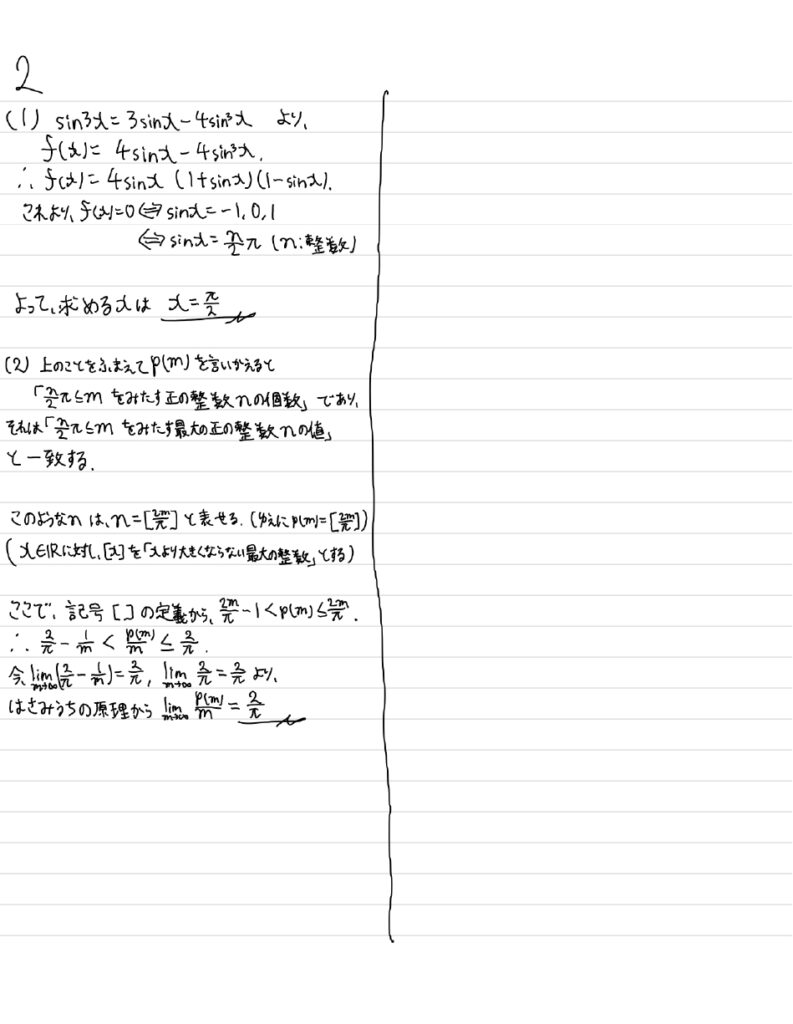 正の実数解は\(x=\frac{1}{2}\pi,\frac{2}{2}\pi,\ …\ ,\frac{[\frac{2m}{\pi}]}{2}\pi\)の、計\([\frac{2m}{\pi}]\)個あることから、\(p(m)=[\frac{2m}{\pi}]\)と分かる。(※記号\([\ ]\)を知らない人は、解答の下にある「補足」を呼んでください。)