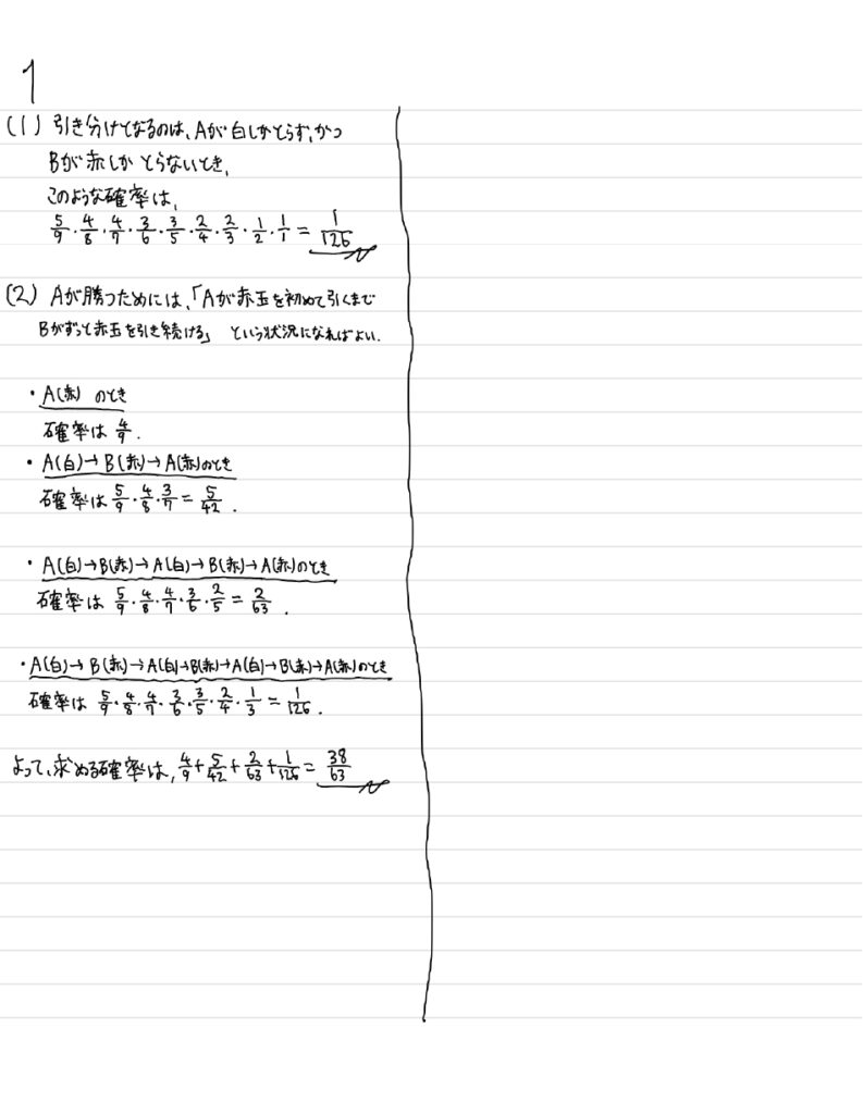 (1) 引き分けとなるのは「\(A\)は白玉しか取り出さず、\(B\)は赤玉しか取り出さない」ときと同じである。
