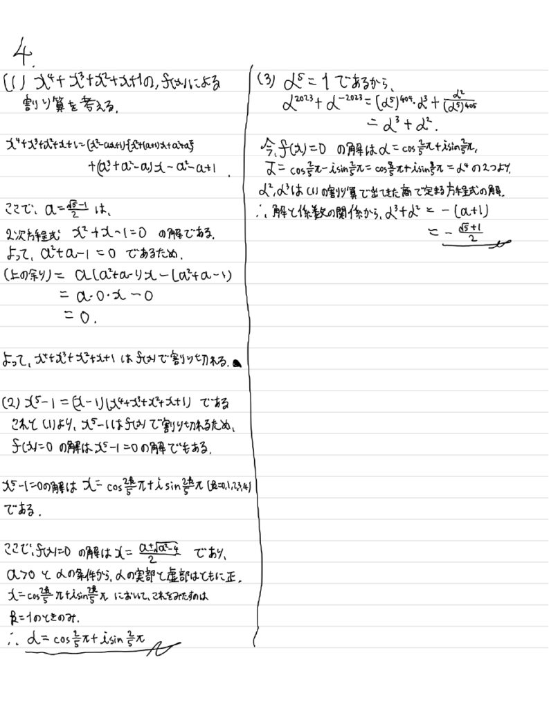 (3) \(\alpha^5=1\)に注意すると、\(\alpha^{2023}+\alpha^{-2023}=\alpha^3+\alpha^2\)となることが分かる。
