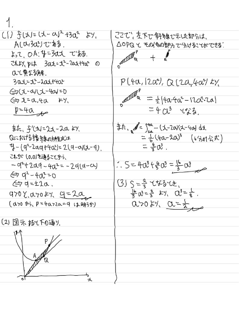 (2) 放物線\(C\)の\(q\leq x\leq p\)の部分、線分\(OP\)、および線分\(OQ\)で囲まれた図形の面積を\(S\)とおく。\(S\)を\(a\)を用いて表せ。