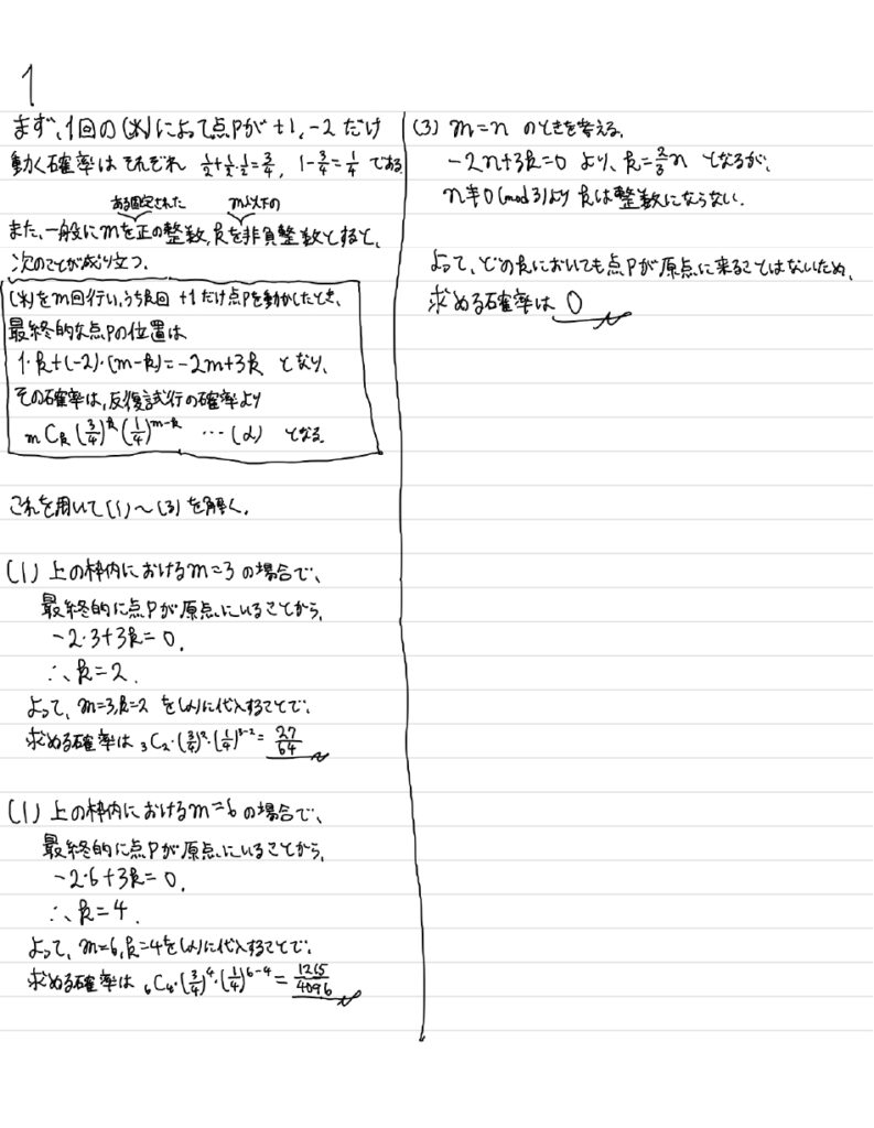 (1) 試行(*)を3回繰り返したときに、点\(P\)が原点に戻っている確率を求めよ。
