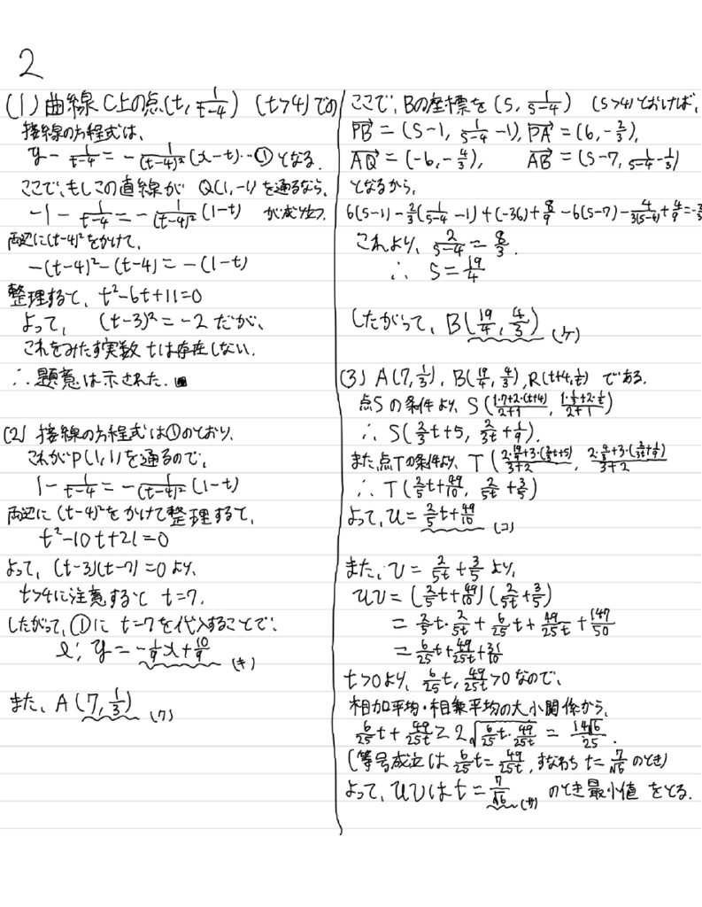 (3)\(A,B\)を(2)で定めた点とする。正の数\(t\)に対し, 曲線\(C\)の点\(R(t+4,\frac{1}{t})\)は点\(A\)と異なるものとする。線分\(AR\)を\(2:1\)に内分する点を\(S\)とし, 線分\(BS\)を\(3:2\)に内分する点を\(T(u,v)\)とするとき, \(u\)を\(t\)の式で表すと\(u=\)(コ)である。また, \(uv\)の値は\(t=\)(サ)のとき最小となる。