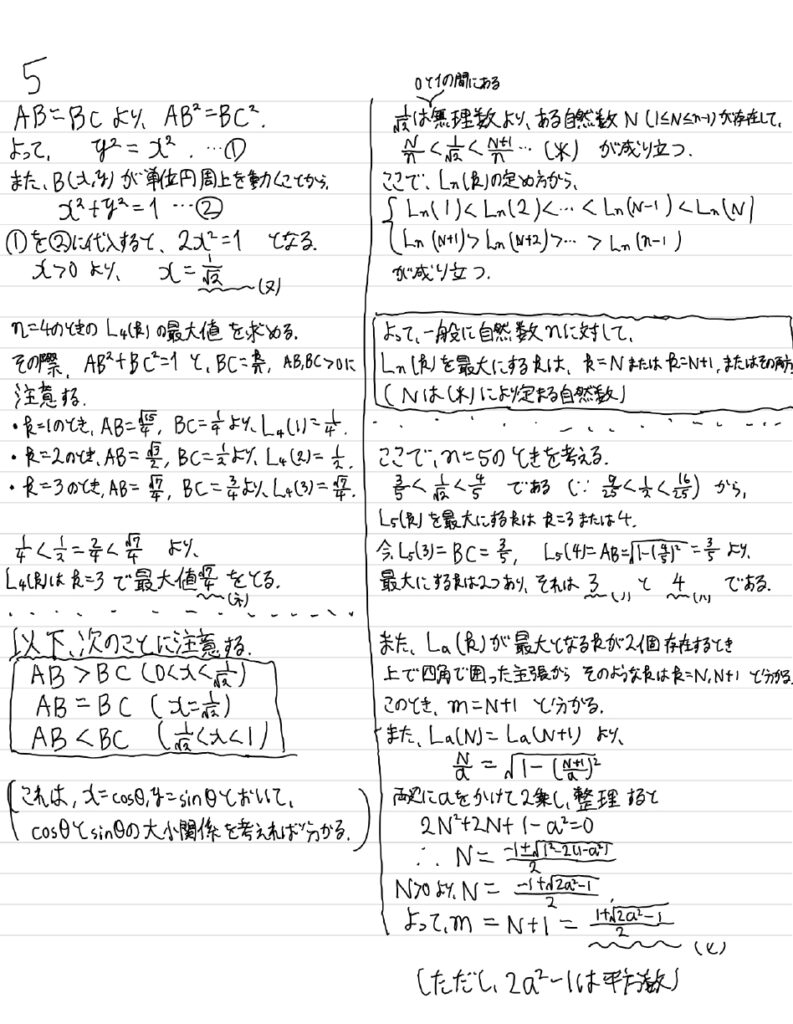 (ヒ)の解答において、条件式\(\frac{N}{a}<\frac{1}{\sqrt{2}}<\frac{N+1}{a}\)を用いて解くことで、ガウス記号を用いて\(m=[\frac{a}{\sqrt{2}}]+1\)と解いた人もいるかもしれないが、ガウス記号が入試においてことわりなく使われることは基本的にないため、これを解答に使用することはできない。