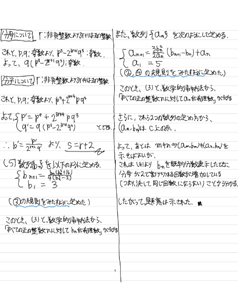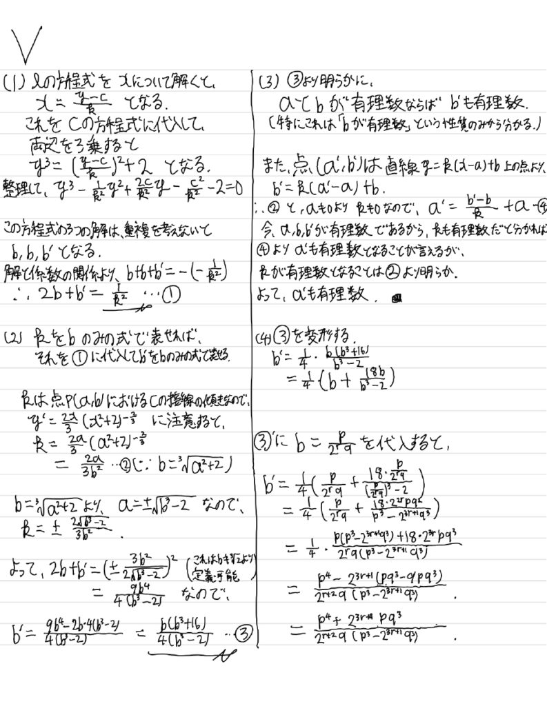 (5) 点\((5,3)\)を\((a,b)\)として考えて有理点(座標がともに有理数となる点)\((a’,b’)\)をとり、 点\((a’,b’)\)に対して同様に有理点\((a”,b”)\)をとり、点\((a”,b”)\)に対して同様に有理点\((a”’,b”’)\)をとり、…という操作を無限に繰り返せることを証明する(このような考え方は大事である。)。